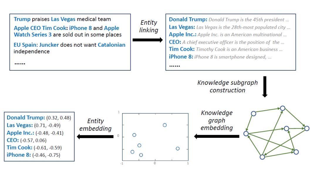 如上图,给出一段新闻,提取新闻中的实体,根据这些实体,构建一个知识图谱的子图,对知识图谱做embedding映射,得到每个实体的embedding,最后就得到每个实体的特征向量。