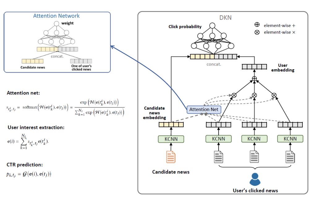 接下来介绍基于KCNN做推荐的方法。如上图假设某个用户已经点击过了3条新闻,来了一个候选新闻,预测该用户对候选新闻的点击率。对这4条新闻做KCNN的embedding映射,得到4个特征向量。因为用户看过的新闻的重要性对候选新闻是不一样的,用Attention Net计算用户看过的每一条新闻和候选新闻的决策分值。用得到的分值加权观看记录,得到User embedding。将user embedding和candidate news embedding拼接,输出一个预测的点击概率,这个就是做预测的DKN模型。