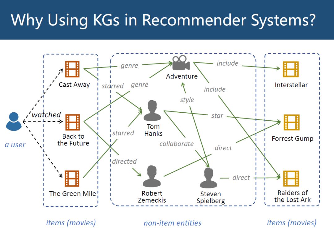 KG建立一个从用户已经看过的电影到没看过的电影的连接,而这些连接不是由用户的观看记录得来的。在CF里,实际上是把中间这块替换成了其他用户,用其他用户历史观看记录得到这些连接。KG提供了另外一种关于物品连接的信息来源的方法。