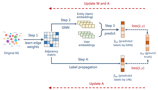 如上图,回顾一下整个模型,把原始异构KG转成weighted graph,学习边的权值,得到一个邻接矩阵,用GNN得到entity embedding,用这个entity embedding 和user embedding来做这个预测,得到预测值