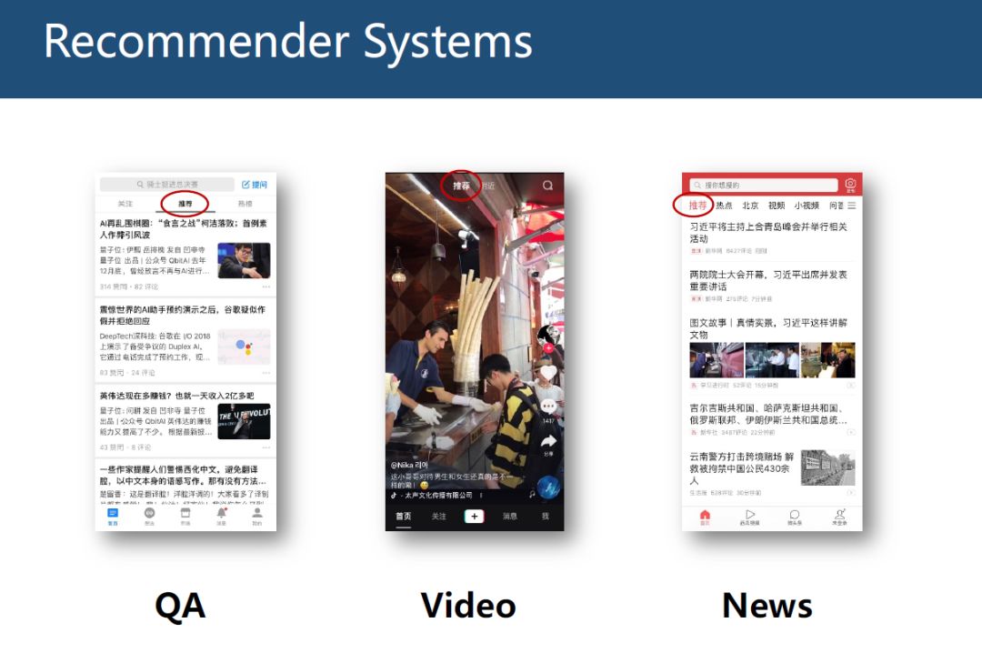 如下图是我们更为熟悉的推荐系统的例子,知乎,抖音,头条等系统,都有推荐功能。