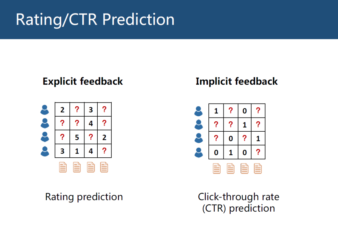 另一个是点击预测 ( CTR Prediction )。右边是点击预测的例子,表格中只有0和1,0表示用户没有点击过,1表示用户点击过,这类数据叫隐式反馈 ( Implicit feedback ),点击预测只能反映用户的非常弱的偏好程度,用户点击了不一定说明用户喜欢,比如逛淘宝,用户只是点击了某个物品就退出了,所以点击物品并不能代表用户的真实感受。