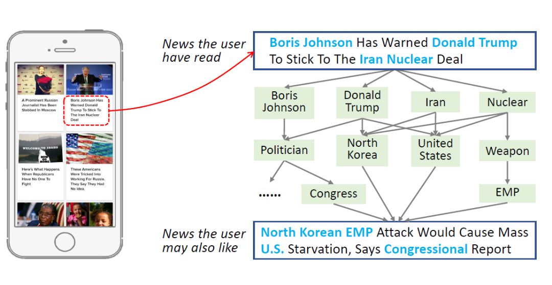 这2条新闻在字面上没有任何相似度,新闻的单词都不一样,但他们是很相关的,这个相关性体现在KG上,他们在低层是相关的,但这种相关性没法从字面意义上得到,这也是为什么要用KG,KG提供了一种item相似度的计算方式。