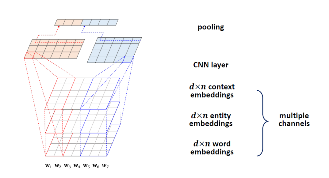 前面介绍中已有3种特征向量,分别是实体embeddings,上下文embeddings,word embedings,我们的方法是把这3种embeddings做一个累加,卷积,池化,最后得到这个sentence的embeddings,这种方法叫KCNN。