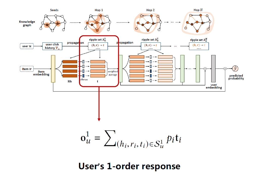 ,在KG中找到对应的Vu,比如图中有2个对应实体,获取这些实体对应的tuple,把实体一跳的集合拿出来。对输入物品v做embedding映射。如上公式,将item embedding v和这些head
