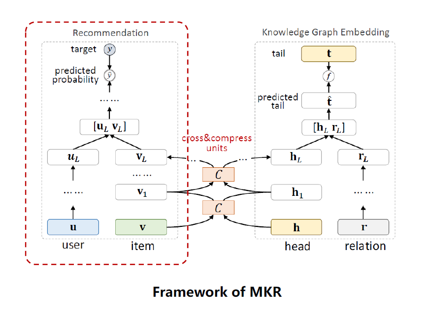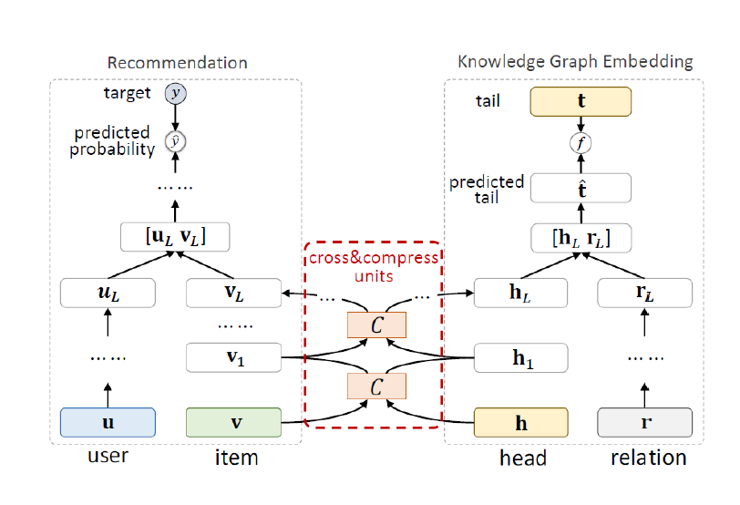 ,item是cross&compress units做的处理,返回一个物品的特征VL,把UL和VL拼接起来,用一个recommendation system函数fRS,输出一个点击预测值。