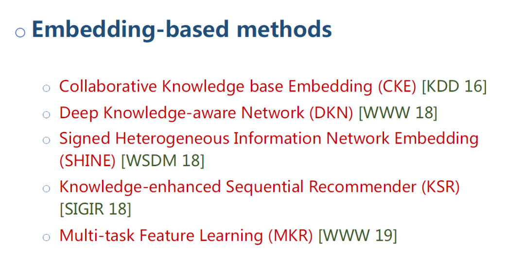 第一类是Embedding-based methods,基于KG embedding的方法,下图列举了5篇论文,今天将会介绍第2篇和第5篇。
