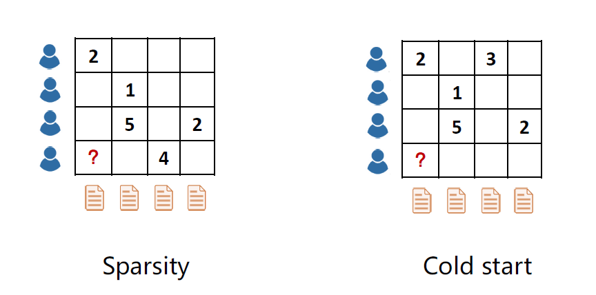 第一类是稀疏性问题 ( Sparsity ),一般情况下评分分布是相当稀疏的,比如一个用户一辈子可能只会看几百部电影,但电影总数达百万量级,所以在计算相似度的时候会有困难。