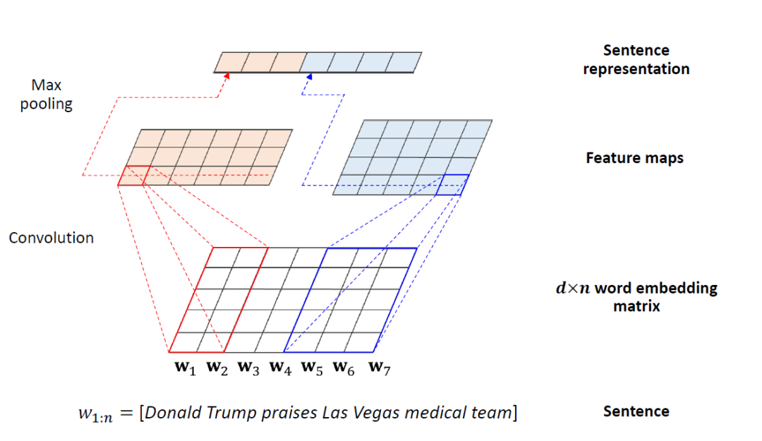 在NLP中有一个模型叫KimCNN,主要是给定一个sentence,返回一个特征向量。如上图给定一个n个单词的sentence ( 图中n为7 ),对每个单词做embedding映射,embedding的长度为d ( 图中d为5 ),得到一个d*n的word embedding矩阵。用7个卷积核做卷积进行featuremaps,得到7个1维向量,对每个向量做池化 ( Max pooling ),得到该sentence的word embedding。