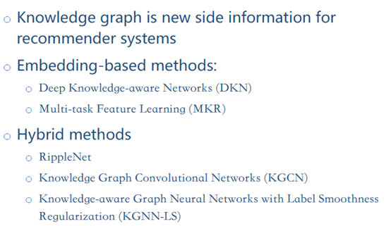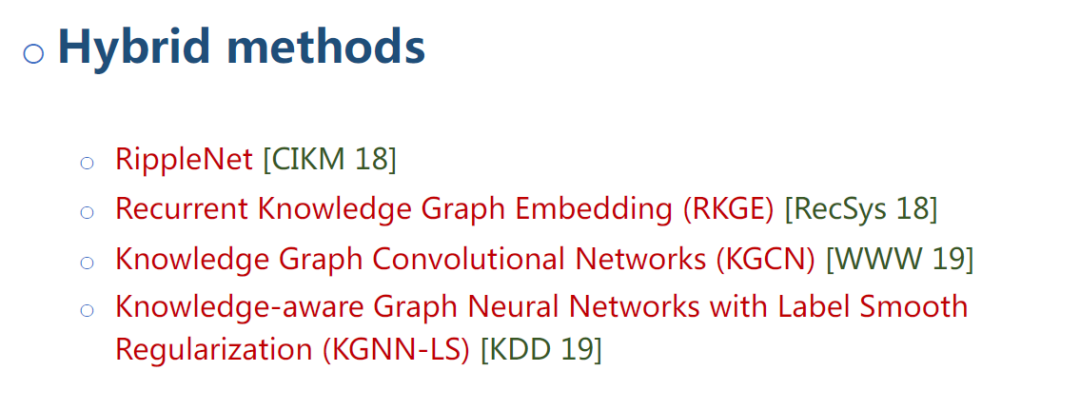 第二类是Path-based methods,基于KG计算路径的推荐方法,今天不会涉及这类方法。