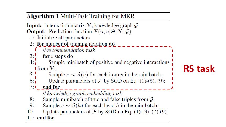 算法实现第1块是推荐系统的任务,第2块是KGE任务,交替训练2者。在每次循环里面,做t次的RS的任务训练,做1次的KGE任务训练,做t次RS训练是因为更关注RS任务,这个t是可以调整的,这就是MKR模型。