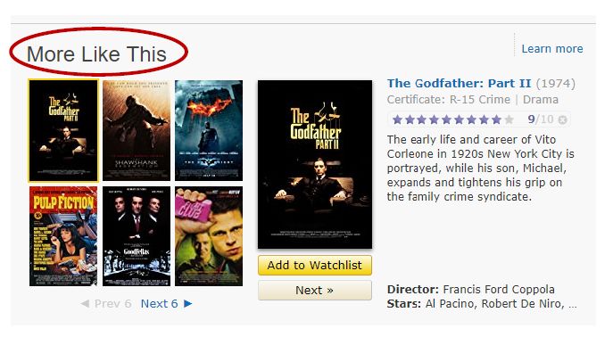 举几个推荐系统的例子。如下图是imdb系统中的电影推荐,imdb会推荐用户可能更感兴趣的电影。