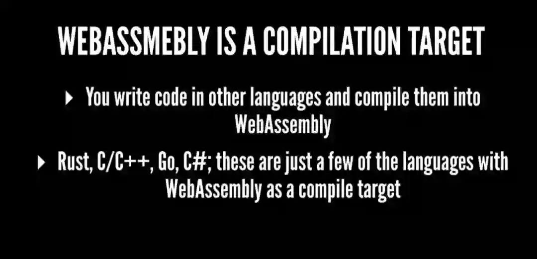 它为其他语言提供编译服务,你可以将其他语言编译成 WebAssembly,它是一种规范(类似于 jvm 支持的 class 字节码)和要编译成的目标文件类型。