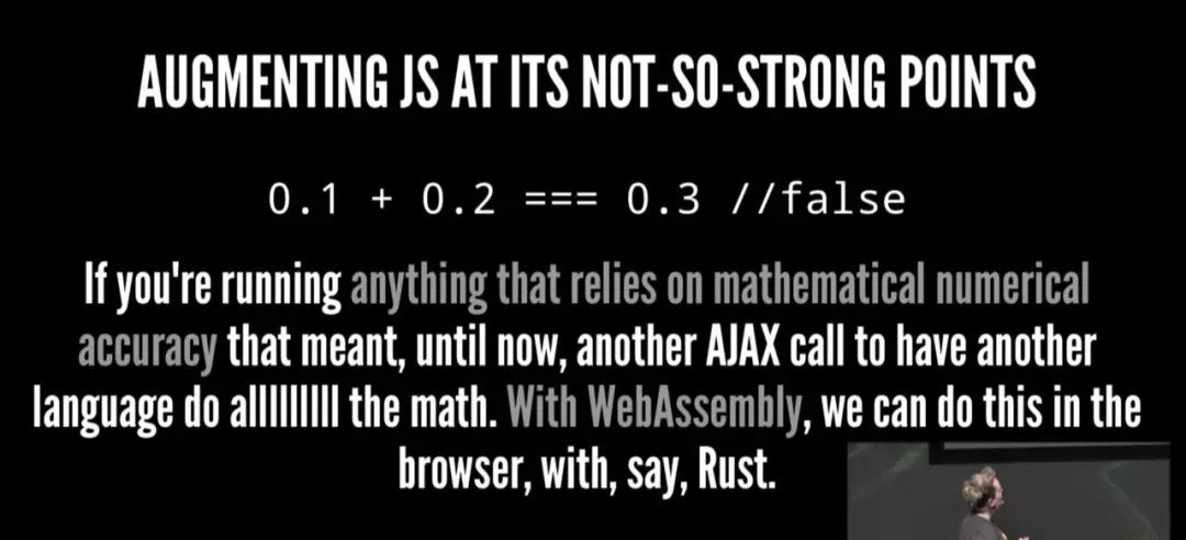 所以通过 WebAssembly,你就可以在浏览器中使用正确的工具来完成这项工作,比如:Rust,C,或者其他浮点数超过32位的语言。