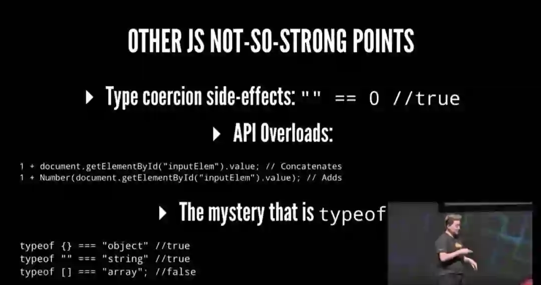 其它 JS 不太强的地方还有,JS 的类型强制转换会有一些负面效应,比如:” “ == 0 为 true。我真的很难去理解它,我可以说他们输入了一个非零的数字。