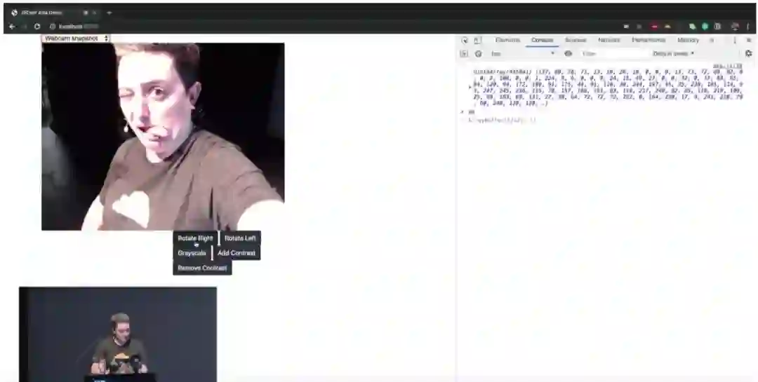 我们点右旋,然后在下面你就可以看到右旋的图片了。这真的真的是很快的了,再左旋一下,你用 CSS 也能快速做到,这好像没什么了不起。我们来调个灰度,boom, 灰度,没有闪屏。我们来加点对比度。去掉对比度呢?去掉对比度了。JS 能这么快吗?不可能!