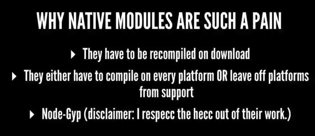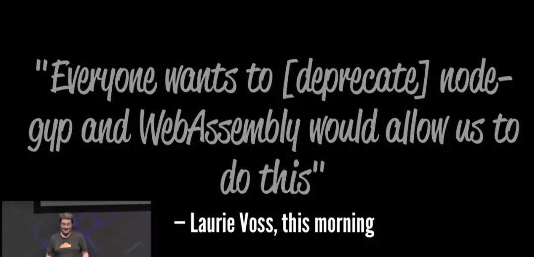 WebAssembly 是 JS 所有形式的未来,尽管我希望能向你展示它将创造更好的浏览器体验。它将弃用 node-gyp。
