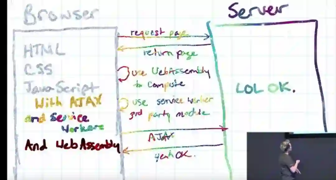这才是我要说的,请看我用高亮颜色所标记出的 WebAssembly 的内容,这里突出了它的工作原理。