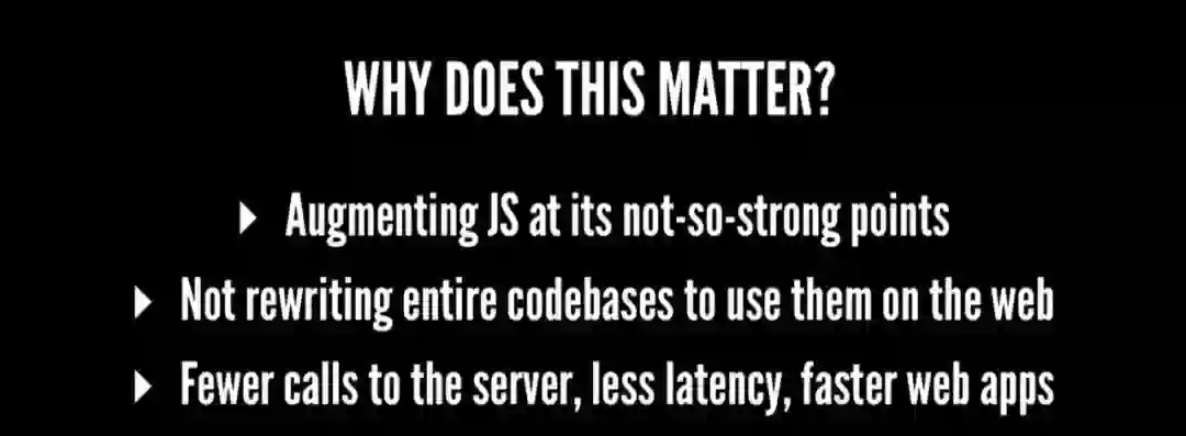 这对于 JS 来说是一种能力的增强。WebAssembly 根本就不是想要取代 JS ,而是仍然让 JS 做它所擅长的领域,同时也能让 JS 也能做它所不擅长的领域,这就是它要做的事情。