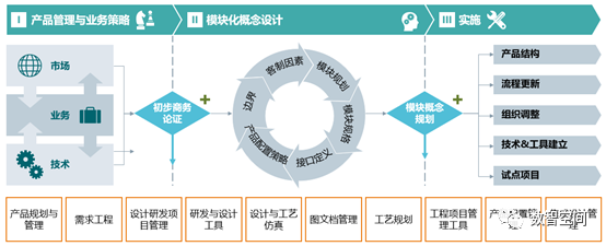 模块化设计方案包括划分建立模块化产品架构(Modular Product Architecture)和对模块的管理两部分内容。前者能指导企业将产品设计进行整理、规划,明确定义企业中的模块,形成模块化设计的基础;后者能够提供IT系统的支持,让企业能够真正的实现基于模块的产品设计。(本图引自西门子咨询徐翰伟博士)