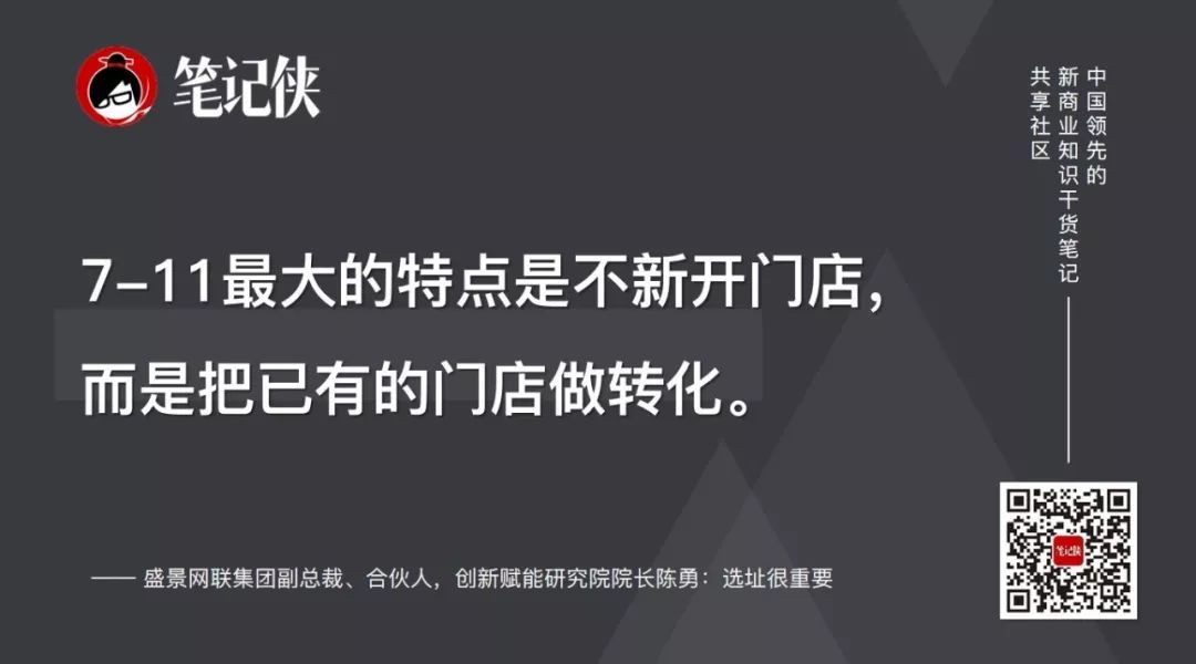 7-11最大的特点是不新开门店,而是把已有的门店做转化。它的很多门店都是由卖酒水或其他商品的店铺转化成便利店。