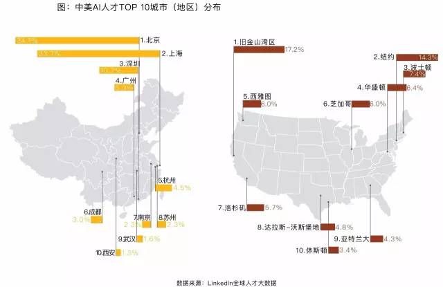 领英大数据显示,中国近7成 AI 人才扎堆北京上海;而美国 AI 人才的分布则星罗棋布,除旧金山湾区(17.2%)和纽约(14.3%),波士顿、华盛顿、西雅图、芝加哥地区也汇聚众多 AI 人才。