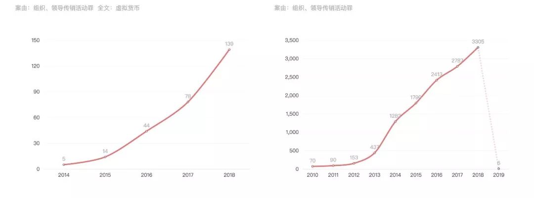 Odaily星球日报查阅中国裁判文书网发现,以“组织、领导传销活动罪”为案由,“虚拟货币”为关键词,一共有 280 个案件,其近几年的增长趋势与传销类案件的增长趋势基本趋同。
