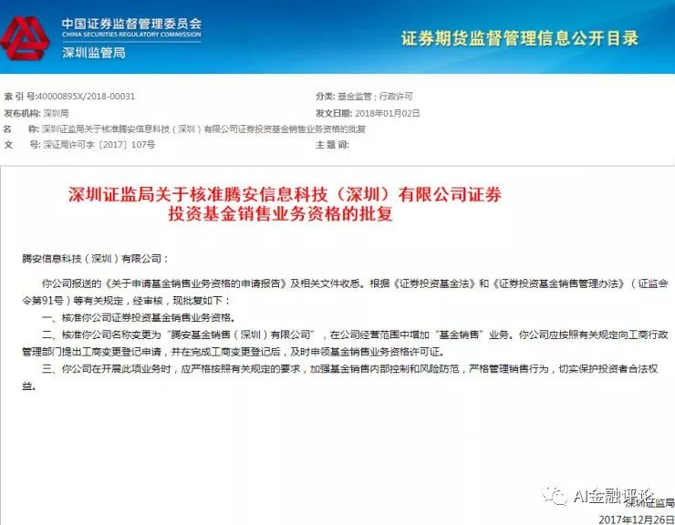雷锋网AI金融评论报道,根据证监会的公开信息披露,深圳证监局已于近日发布关于核准腾安信息科技(深圳)有限公司证券投资基金销售业务资格的批复。批复原文中显示,腾安信息科技(深圳)有限公司将更名为腾安基金销售(深圳)有限公司,允许在公司经营范围中增加“基金销售”业务。