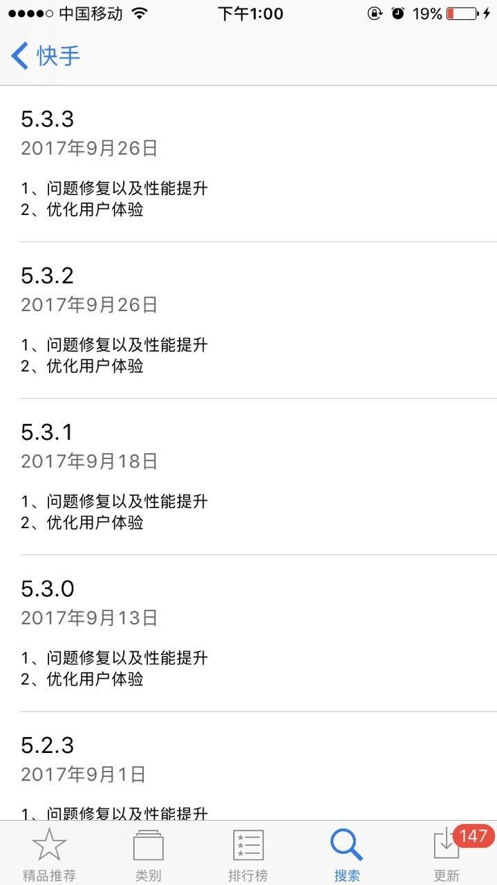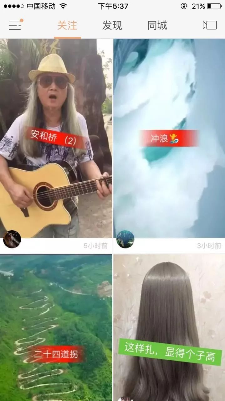 另外,我发现快手的产品表现层上几乎没有任何改动,架构上始终只有三个Tab“关注”、“发现”和“同城”。其在App Store上的版本记录里,每次都只有两点。