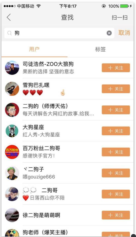 点击页面左上角的小图标,进入到个人中心页面,在搜索框中输入某个关键词,会列出昵称中和个人介绍中含有该关键词的用户,并按照关注用户的多少进行排序。