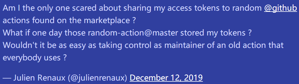 我们中有多少人会去查看action的代码,检查其中是否包含恶意代码?我猜没有人会这么做。我们都会自动相信作者。