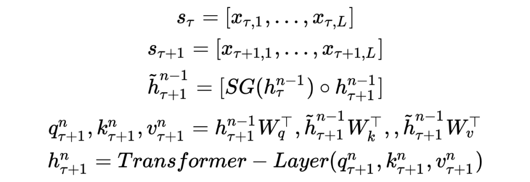 而为了解决这一问题,Transformer-XL 引入了一个 memory 状态,在对当前 segment 进行处理的时候,缓存并利用上一个 segment 中所有 layer 的隐向量序列,综合两个 segment 的信息进行 attention 等操作。为了节约计算资源的开销,上一个 segment 的所有隐层向量只参与前向计算,不进行反向传播,具体计算过程如下: