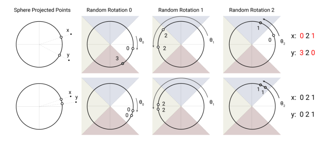 首先我们可以介绍一下局部哈希算法,如下图所示,对于空间中的点,先将其投影到一个圆上,然后将分成八个区域,每个区域都代表一个独立的值。随机转动圆,记录下投影后的点所在区域的值;那么经过多次转动后,就为一个点得到了多个值,这些值就是点的哈希值。