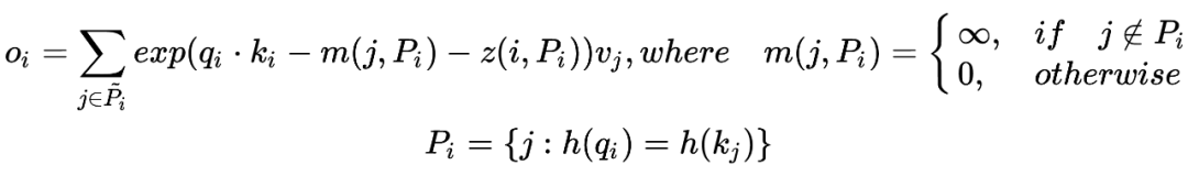 啧表示当前字符注意的区域,这里规定为当前字符的 query 的哈希值和序列中 key 的哈希值相同的位置进行 Attention 操作。经过这些定义,我们可以将原序列按哈希值进行排序,并分为
