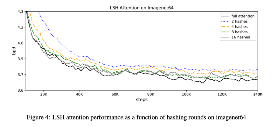 随后论文针对局部哈希 Attention 的优化做了一个很有意思的实验,该实验的任务是重复句子的单词预测,即将两个相同的句子通过特殊字符拼接在一起,以