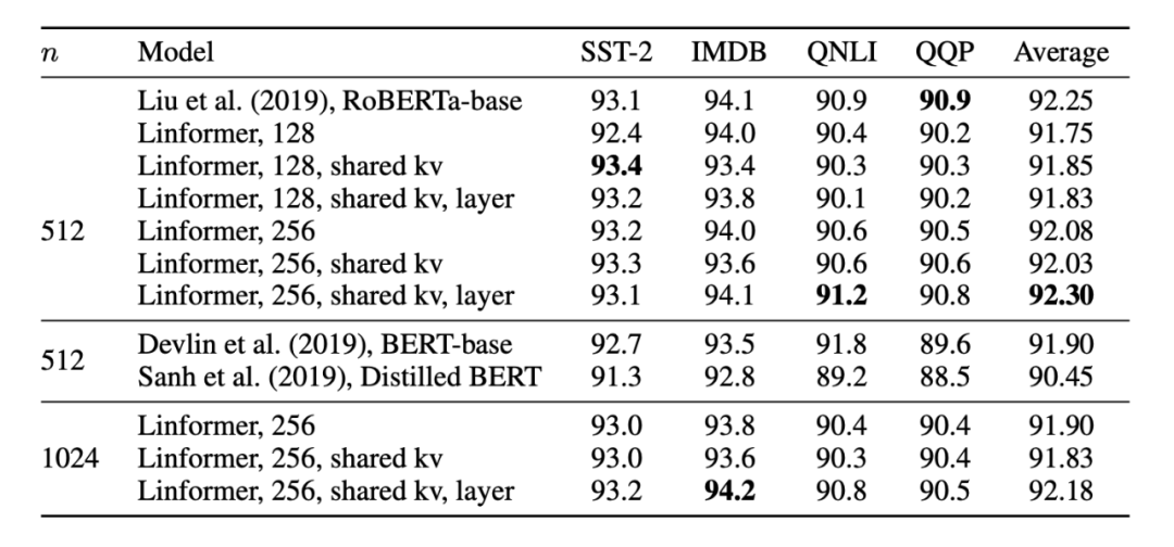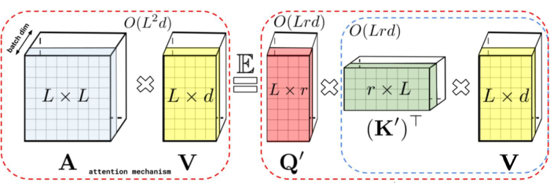 由公式和模型图均可知 Linformer 在 V 和 K 参与 Self-Attention 计算之前,通过两个投影矩阵将其序列长度那一维降至一个固定值,因此无论原始序列的输入长度是多少,最后均会变成一个 k 长度的向量,最后 Self-Attention 的时间复杂度也会变成线性复杂度。