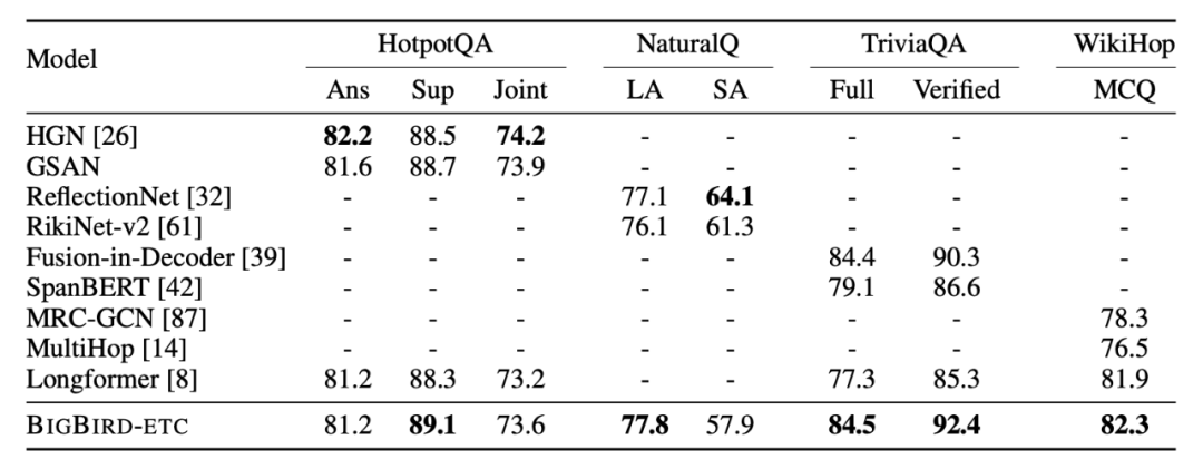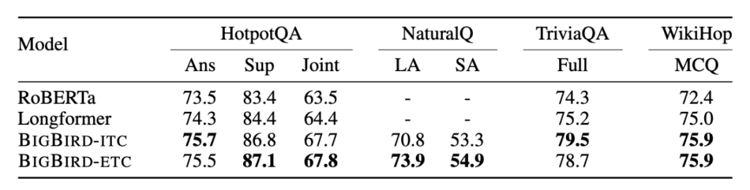可以看出 Longformer 较之于之前的模型有一个更好的效果,而如前文所提到的,Longformer 是专门为 NLP 任务设计的 Transformer 模型,因此其在下游任务上的表现也很重要。因为只修改 Attention 的范围,不修改模型的结构,可以直接在预训练模型 Roberta 的 checkpoint 上继续训练并且运用到下游任务上,这里预训练的任务也是 MLM。将窗口大小设置为 512,添加了额外的 position embedding 到 4096 的大小,通过多次复制其 512 个位置嵌入来对其进行初始化。