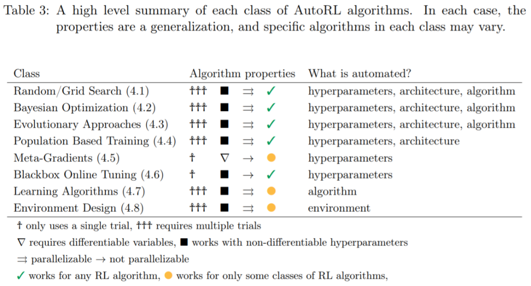 如下表 3 所示,该研究按照大类总结了 AutoRL 方法的分类,方法分类将体现在第四章的每一小节: