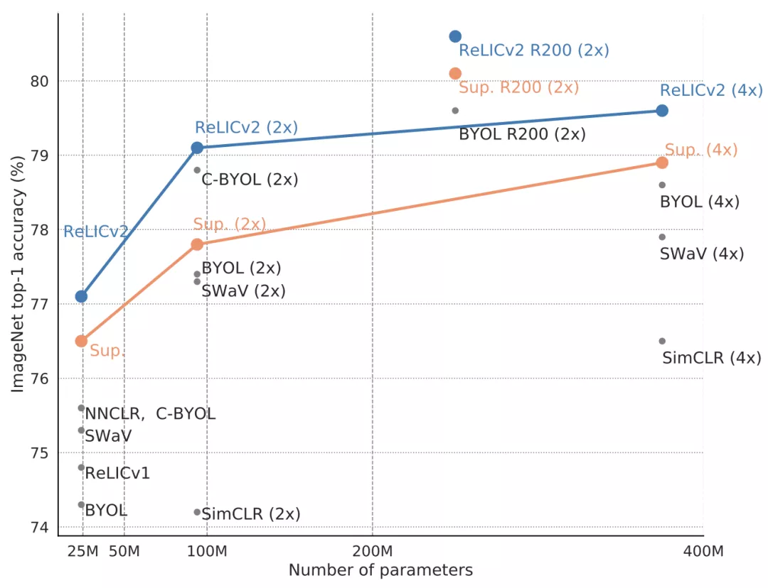 尽管自监督方法最近在残差网络表示学习方面取得了进展,但它们在 ImageNet 分类基准上的表现仍然低于监督学习,这限制了它们在性能关键设置中的适用性。基于先前的理论见解(Mitrovic 等人,2021 年),DeepMind、牛津大学、图灵研究院联合推出了 RELICv2,它结合了明确的不变性损失和对比目标,该研究证明在 ImageNet 中使用相同网络架构进行同等条件下的对比,无标注训练数据集的效果可以超过有监督学习。