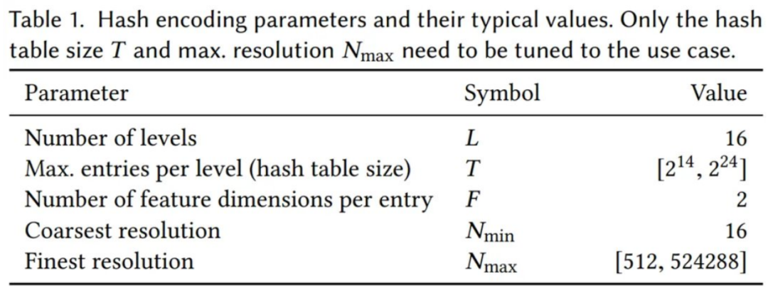 英伟达的神经网络不仅有可训练的权重参数 Φ,还有可训练的编码参数 θ。这些被排列成 L 个级别(level),每个级别包含多达 T 个 F 维 的特征向量。这些超参数的典型值如下表 1 所示:
