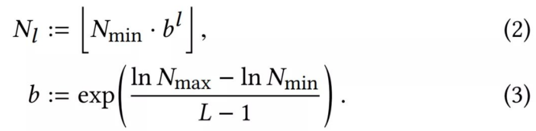 如上图所示,每个级别(其中两个分别显示为红色和蓝色)都是独立的,并在概念上将特征向量存储在网格顶点处,其中最低和最高分辨率之间的几何级数 [N_min, N_max] 表示为: