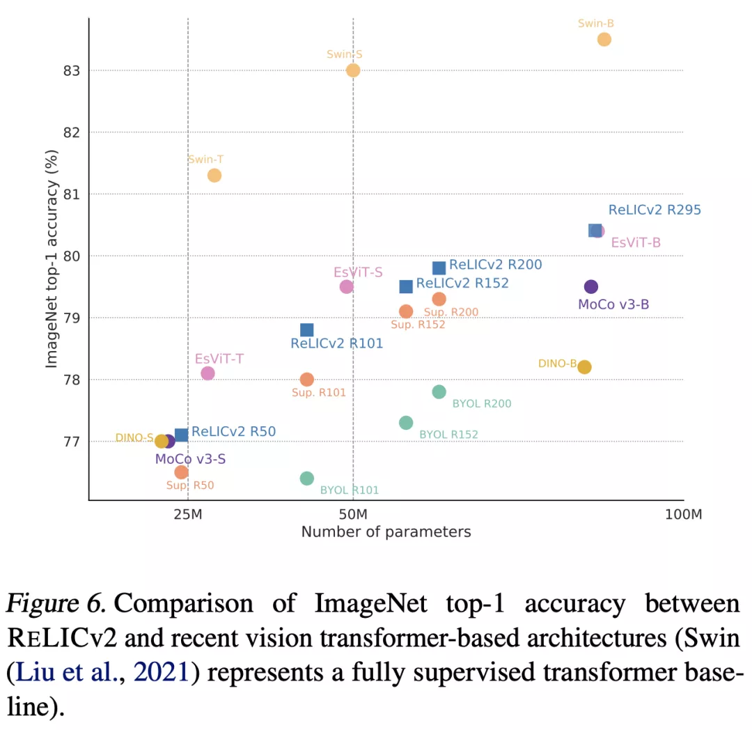 值得注意的是,RELICv2 是第一个使用一系列标准 ResNet 架构(ResNet101、ResNet152、ResNet200)在同类比较中始终优于监督基线的表示学习方法。最后,该研究表明,尽管使用了 ResNet 编码器,RELICv2 仍可与 SOTA 自监督视觉 transformer 相媲美。