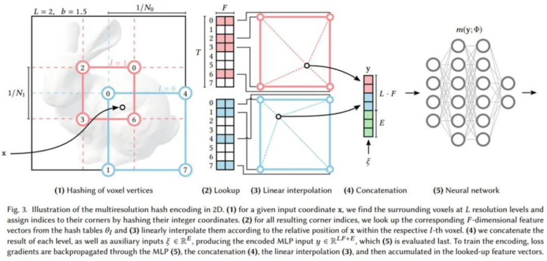 然后是高效性。英伟达的哈希表查找是,不需要控制流。这可以很好地映射到现代 GPU 上,避免了执行分歧和树遍历中固有的指针雕镂(pointer-chasing)。所有分辨率下的哈希表都可以并行地查询。下图 3 展示了多分辨率哈希编码中的执行步骤: