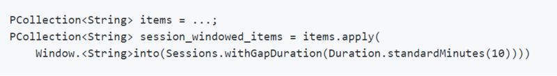 例如,下面 Google Cloud Dataflow 程序(请参阅:https://cloud.google.com/dataflow/model/windowing )会创建一个会话窗口,如果针对某个 Key 在 10 分钟内都没有数据达到,则会触发该会话窗口 (译者注: 例如某个用户在访问 APP 期间中断了 10 分钟没有操作)。 而间隔 10 分钟后,如果新的数据到达,系统将创建一个新的会话窗口。