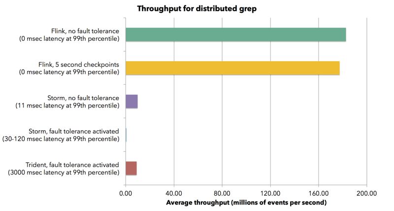 我们在 Google 云上,组建 30 台机器总计 120Core 的集群,用来测量 Flink 和 Storm 对两个不同程序的吞吐量。 第一个程序是并行流式 grep 任务,它在流中搜索包含与正则表达式匹配的字符串的事件。grep 应用程序具备的特征能够让 grep 非常容易做到并行处理,并且基于流分区进行伸缩。