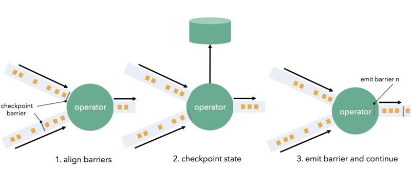 Barrier 流向下游并在通过 Operator 时触发状态快照。 Operator 首先将 Barrier 与所有传入的流分区(通常 Barrier 具有多个输入)对齐,上游来源较快的流分区将被缓冲数据以等待来源较慢的流分区。 当 Operator 从每个输入流分区都收到 Barrier 时,它会检查其状态(如果有)并写入持久存储,这个过程我们称之为状态写检查。一旦完成状态检查点,Operator 就将 Barrier 向下游转发。 请注意,在此机制中,如果 Operator 支持,则状态检查点既可以是异步(在写入状态时继续处理),也可以是增量(仅写入更改)。