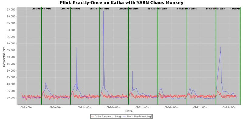 同样,我们在一个 30 节点的集群中运行这个程序,其中“YARN chaos monkey”进程每 5 分钟将随机杀死一个的 YARN 容器。 我们保留备用 worker(即 Flink 中的 TaskManagers),这样系统可以在发生故障后立即获取到新资源并运行作业,而无需等待 YARN 启动新的容器。接着,Flink 将重新启动失败的 worker 并在后台将其加入到 Flink 调度集群中,以确保备用 worker 始终可用。