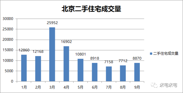 这是北京今年的二手住宅成交量,从3.17新政之后一路下滑,到7月达到了最谷底。从8月开始缓缓复苏,环比7月涨幅7.74%,9月环比8月涨幅15%。虽然实际成交量绝对值仍然未突破10000套,但突破8000套的二手房市场已经呈现缓慢复苏的势头。