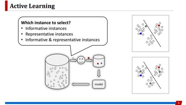 这个问题在过去几十年间,一直是主动学习这个方向研究最关注的一点。以往的方法大概可分为这两类:一类方法,倾向于选择最有信息的样本,例如,我去教你最不会的东西应该是对你最有帮助。另外一类方法,是倾向选择最有代表性的样本,希望选择的样本涵盖数据整体分布的信息。