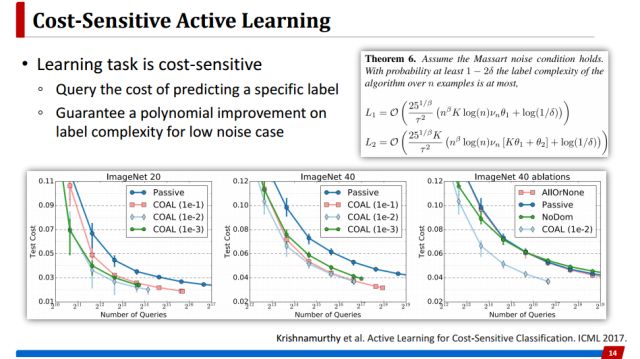 此外,学习任务本身也是代价敏感的,这个敏感体现在把某一类样本错分到另外一类上,所付出的代价可能是不一样的。所以这个工作考虑的是这种情况,它每次查询不再是某一个样本的标记,而是去查询这个样本如果被分成某一个类别所付出的代价会是多少。这个工作除了在实验上取得好的效果之外,在理论上也证明如果噪声条件不是很强的情况下,可以显著降低标记复杂度。
